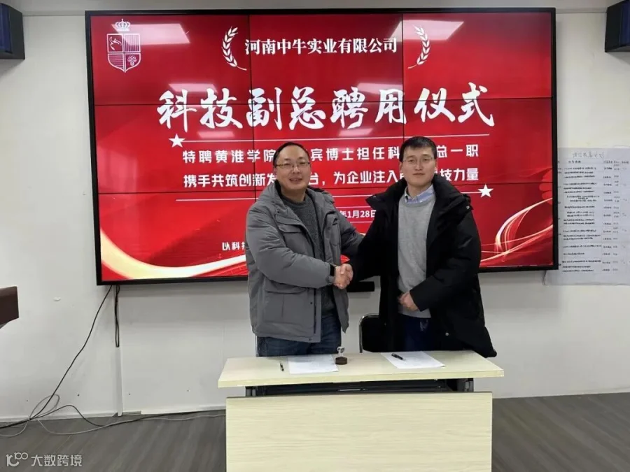人才是企业创新发展的核心引擎,为夯实科技创新根基、践行创新发展理念,河南中牛实业有限公司于1月28日重磅官宣:正式聘任黄淮学院曹连宾博士为公司科技副总,以高端人才赋能企业高质量发展,彰显公司深耕绿色皮革产业、聚力创新升级的战略远见与责任担当,更标志着公司在探索科技、人才与产业深度融合的道路上迈出坚实一步。