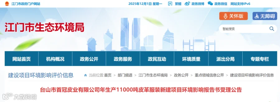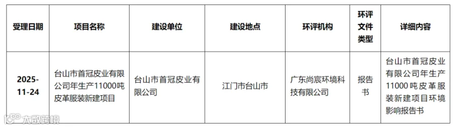 台山市首冠皮业有限公司年生产11000吨皮革服装新建项目环境影响报告书受理公告