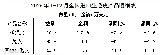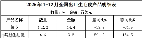 2025年1-12月,全国进口生毛皮产品430.1吨,进口额783.6万美元,同比分别下降90.9%和81.1%;产品进口单价18.2美元/千克,同比增长108.7%。