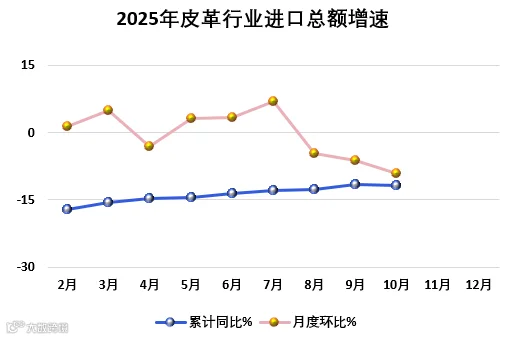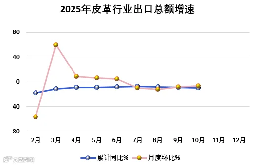 2025年1-10月全国皮革行业进出口额同比降幅均加大