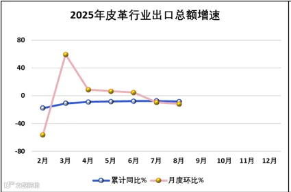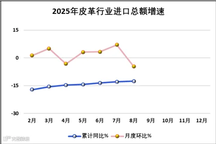 2025年1-8月全国皮革行业出口额同比降幅加大,进口额同比继续收窄