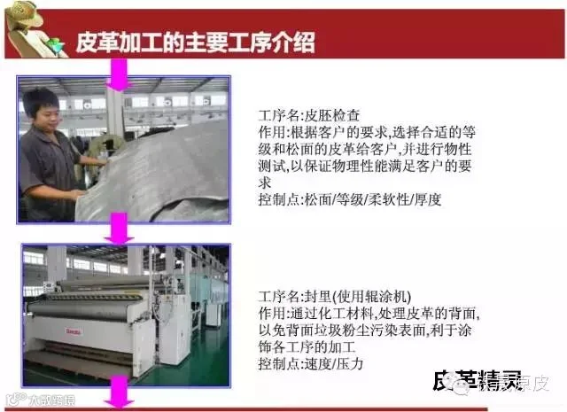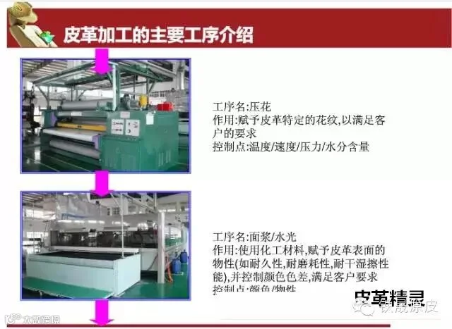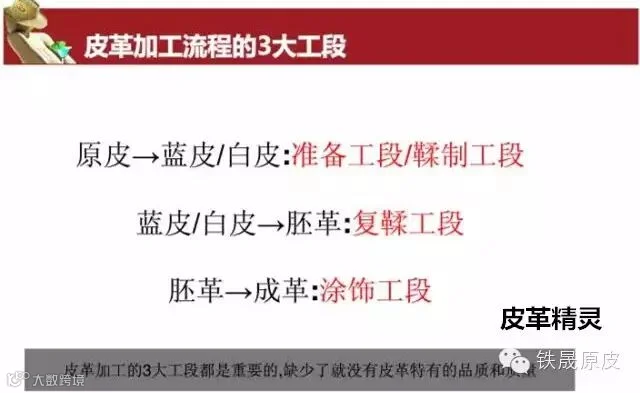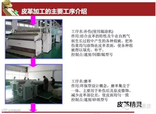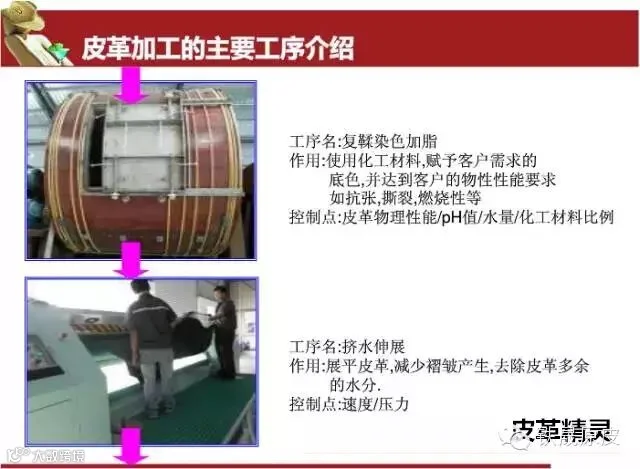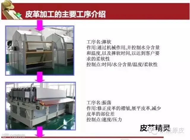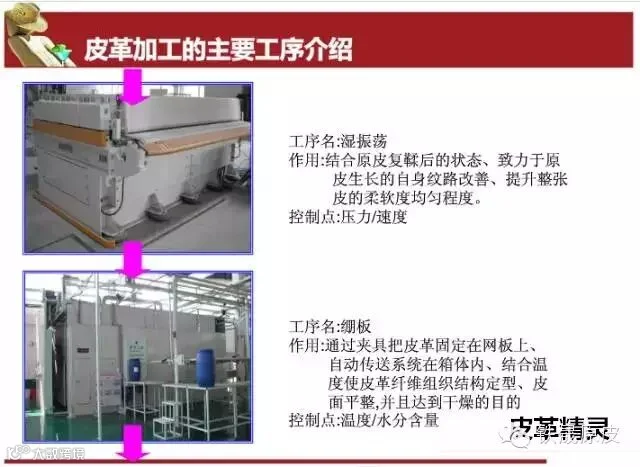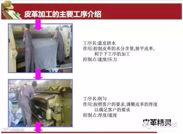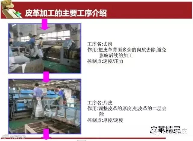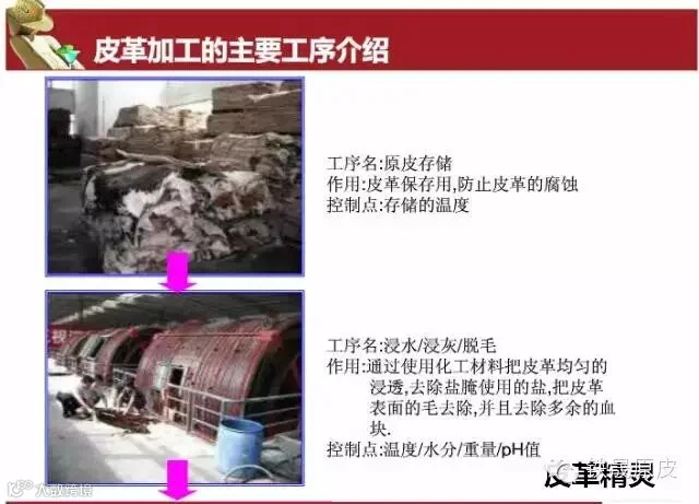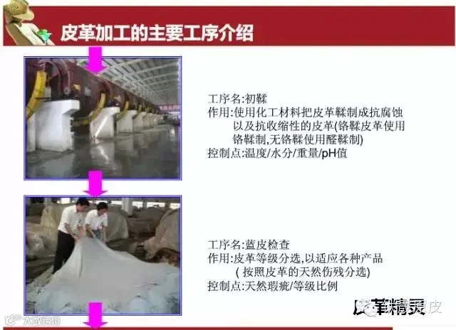 主要流程:生皮分类—预浸水—去肉—主浸水—预浸灰---去肉(片皮)---复灰—脱灰---酵解,软化---脱脂---浸酸---铬鞣—提碱