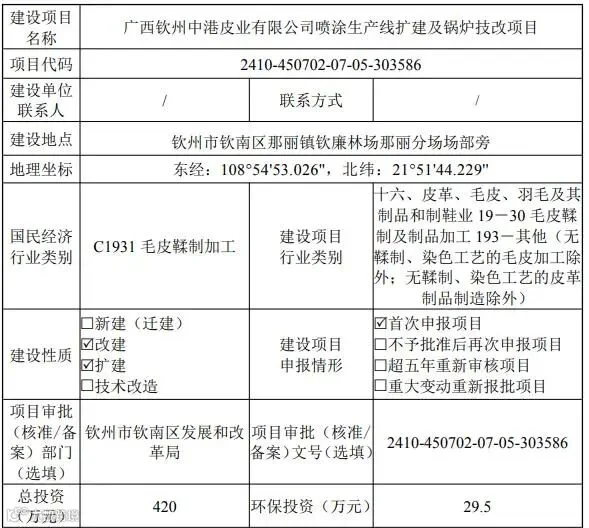 项目名称:广西钦州中港皮业有限公司喷涂生产线扩建及锅炉技改项目
