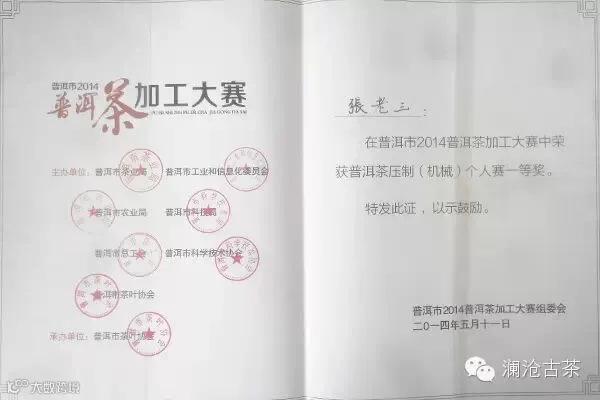 本次大赛由普洱市茶业局、市农业局、市总工会、市茶叶协会联合主办,包括晒青毛茶手工制作、普洱茶压制(机械)和普洱茶包装(内包)三项比赛,分组队参赛和个人报名参赛。其中,参赛团体25个,个人 177名。最后,澜沧古茶压制车间张老三以精湛的压茶技术荣获普洱茶压制(机械)个人赛一等奖。普洱市政府副市长杨卫东出席颁奖仪式并为获奖选手颁发了奖状。
