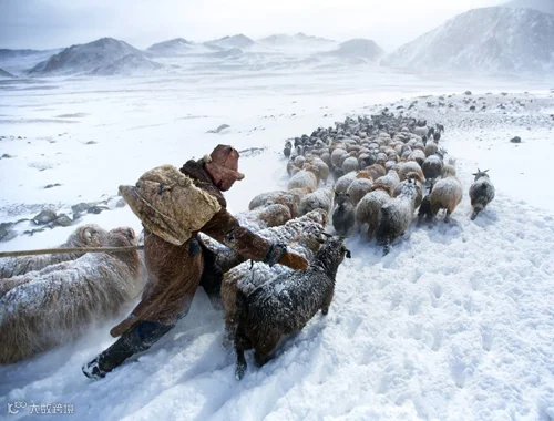 一位牧羊人与他的羊群穿行在蒙古阿尔泰山区的雪域高原上。阿尔泰山脉 – 含义是金色的山脉 – 绵延1200英里穿过中国,蒙古,俄罗斯及哈萨克斯坦。