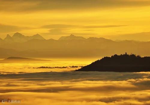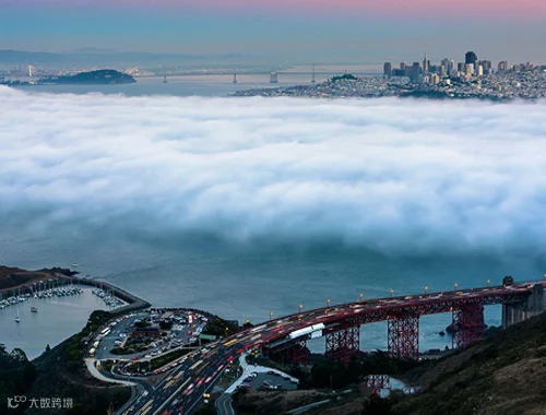 低沉的云海将无疑将旧金山最著名的地标-金门大桥搞得忽隐忽现,浓雾将桥塔淹没,使得它看上去像悬浮在空中。