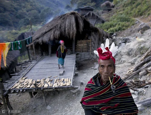 一男人穿着传统的服饰离开位于缅甸钦邦州Kyar Do村的邻居的家。