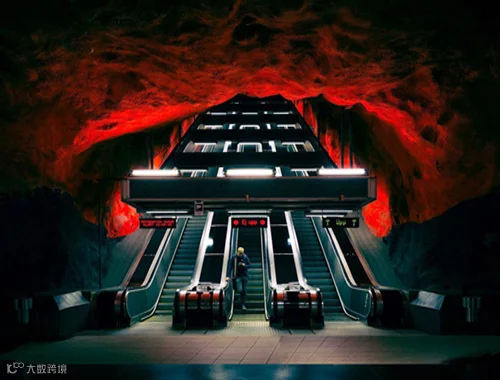 通过戏剧化的灯光,位于斯德哥尔摩市的市政厅地铁站看上去类拟于火山的内部。该地铁站是斯德哥尔摩市中采用外露的基岩及利用有机建筑来设计的其中的一个。