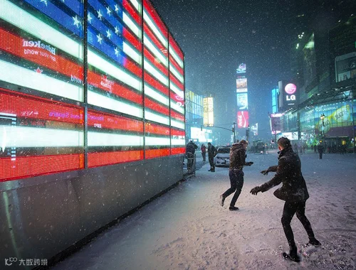 冬天一场暴风雪在纽约城的早春一月留下了6-11英寸的积雪,在原本静静的时代广场引发了一场雪仗;此区域称作是世界上人数最多的观光胜地,平常这里是充满着汽车与行人。
