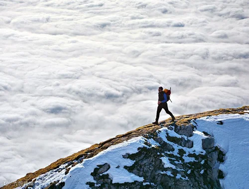 一位徙步者在斯洛文尼亚卡姆尼克阿尔卑斯山在厚厚的云层上面穿行在陡峻的山梁上;该山脉从斯洛文尼亚绵延至奥大利。