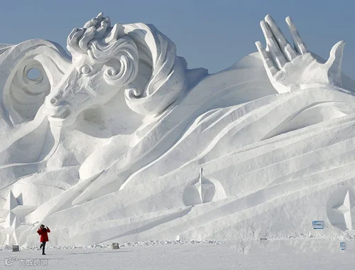 在中国哈尔滨冰雪雕塑节开幕前建成的一具巨大的雪雕使得一位正在摆拍的妇女显得更小。该一年一度的节日活动丰富包括冰雪雕刻作品,滑冰,灯光照亮的冰城等。