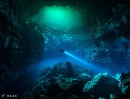 一位潜水爱好者在探索图卢姆的一洞穴。古代马雅人相信雨神Chaak生活在这些天然洞穴中。现在考古学家正在进行这些古代人们的圣地的新的探索。