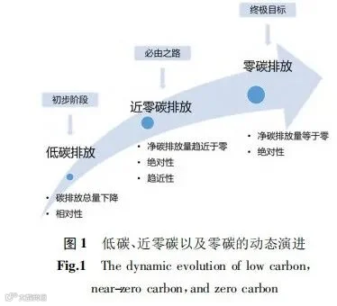 简言之,低碳排放是我国经济低碳转型的初步阶段,近零碳排放是必由之路,零碳排放是终极目标(图1)。
