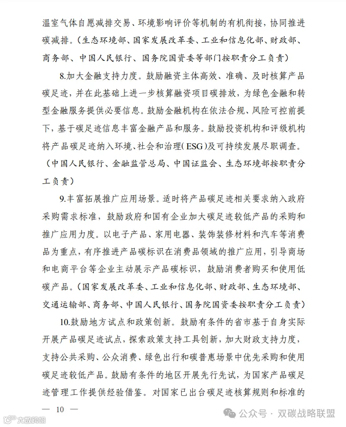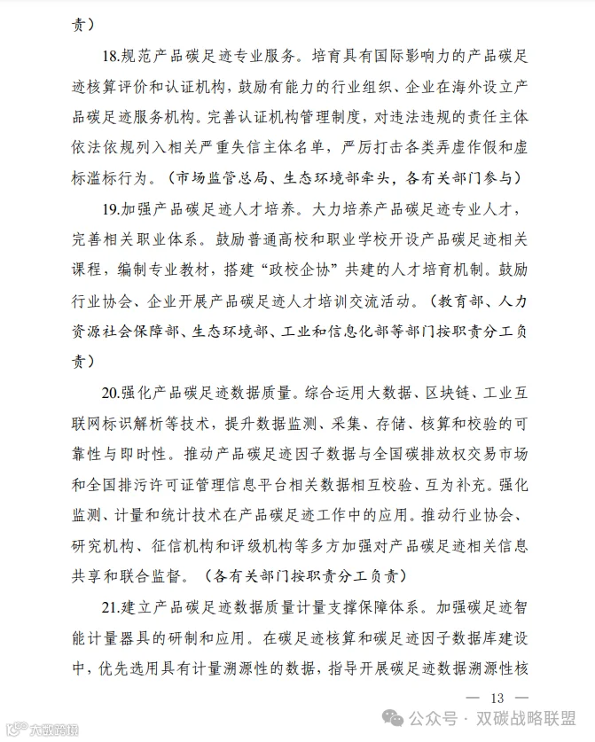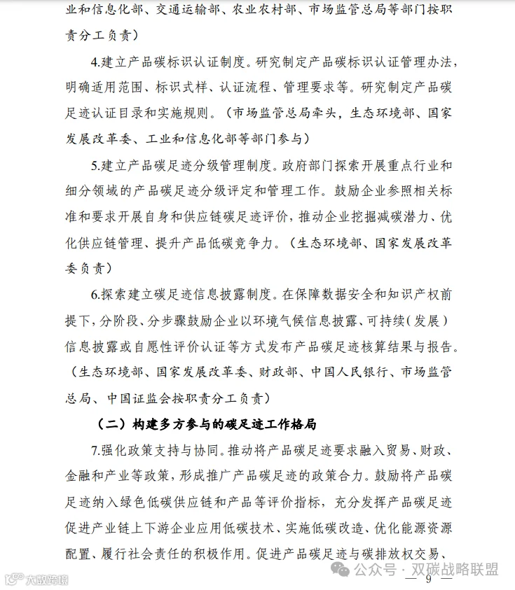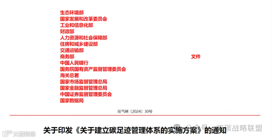 为深入贯彻落实《中共中央 国务院关于全面推进美丽中国建设的意见》《中共中央 国务院关于完整准确全面贯彻新发展理念做好碳达峰碳中和工作的意见》和《2030年前碳达峰行动方案》部署要求,加快建立碳足迹管理体系,形成绿色低碳供应链和生产生活方式,推动新质生产力发展,助力实现碳达峰碳中和目标,生态环境部会同国家发展改革委、工业和信息化部、财政部、人力资源社会保障部、住房城乡建设部、交通运输部、商务部、中国人民银行、国务院国资委、海关总署、市场监管总局、金融监管总局、中国证监会、国家数据局制定了