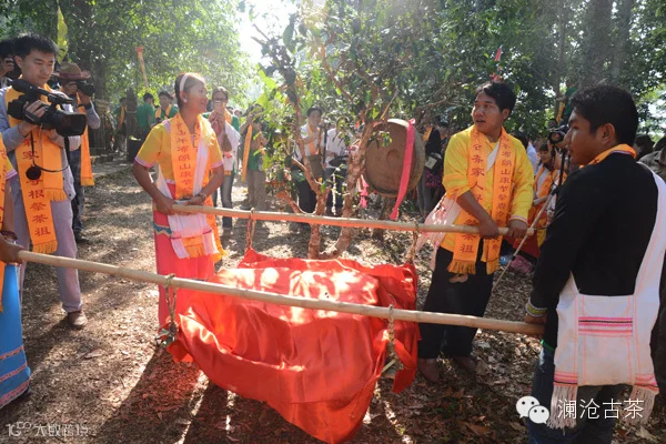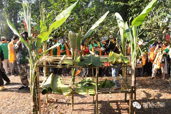 千呼万唤之下,在茶祖岩冷的祖基地,在岩冷带领布朗族先民种下的第一棵茶树的岩冷山上,七提加七片2014年传奇001被鲜红的绸布覆盖着,端坐在竹架上被请了出来,绕主祭台一周后回到主祭台正面茶魂树下的茶魂台前。
