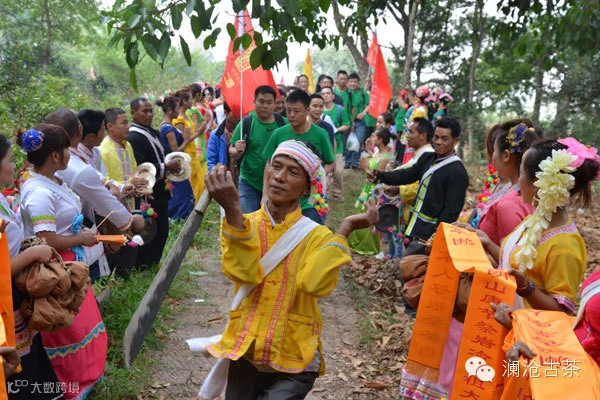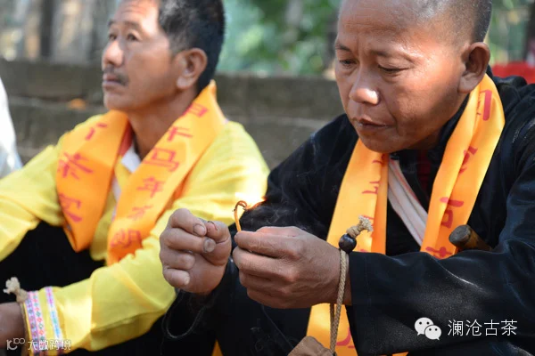岩冷山下,身穿五彩服饰的各少数民族兄弟姐妹已早早分列于山脚,等候远方归来寻根的各地爱茶之人。响亮悦耳的锣鼓、雄壮有力的刀舞,景迈的家人们以最庄重热烈的礼仪迎接着各地的古茶家人,并奉上祭祀用的黄色围巾与蜡条、茶米。