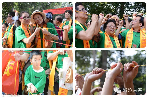随后,茶妈妈杜春峄将一捆总长666米,寓意幸福吉祥的黄色丝带缠绕在主祭台前的茶树之上,再通过在场古茶家人的接力传递,一个接一个,联上现场的每一个古茶家人,接着,由王钧总经理将丝带的一头系在披着红绸布的传奇001竹架上,绕满一周后,再缓缓牵出,最终回归到传奇001之上。