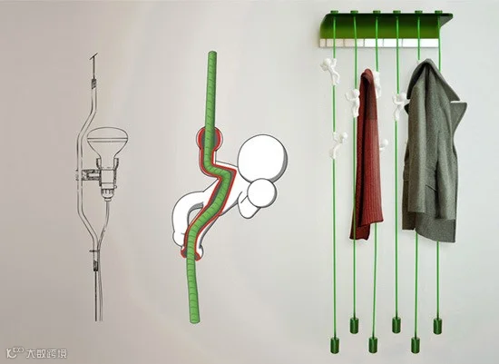 把衣服挂起来的方法有很多,简单的可以是钉一根钉子,常见的是装一个或是一排挂钩,有趣的,可以像这样,是一个个在绳子上攀爬的小人。这些穿在绳子上的小人生动可爱,圆滑的身体可避免给衣物带来损害。