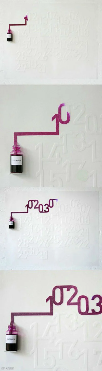 【墨水日历】用一条贯穿整个月份的纸带浸在墨水瓶中,利用毛细管作用,有色墨水开始缓缓移动,和日出日落相匹配的速度清晰的显示出当天的日期,够个性。