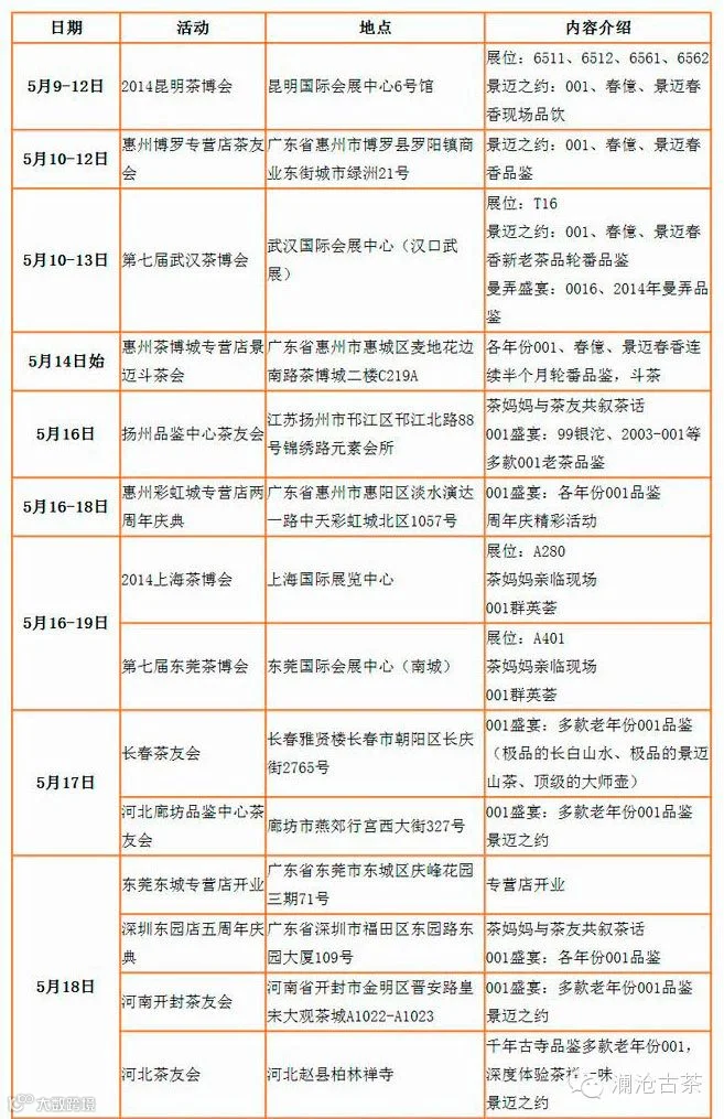 从5月9日开始,我们将整装亮相昆明、武汉、上海、东莞、广州五大茶博会,展现澜沧古茶精致大气品牌形象。001群英荟,历代001冲泡、品鉴、交流大赛,攻擂守擂等您来战;001盛宴,新老001带您领略澜沧古茶十五年经典之作的韵味;景迈之约,001、春億、景迈春香等历代景迈系列经典茶品品鉴,让您体验景迈之香的纯粹;湛江仓储藏养交流会,则为全国茶友带来湛江“时光仓”酝酿的藏养精品;各地品鉴中心、专营店隆重开业,遍地开花,古茶之家硕果累累,发展壮大;更有大北方、普洱、惠州等地热烈响应,展开一系列精彩活动。