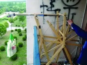 最近,中国传媒大学南广学院某宿舍的11名男生再也不用为从6楼跑去拿盒饭而发愁了。他们宿舍的小周同学发明了一个类似老式纺纱机的“外卖神器”,只要转下轮子,短短20秒就能把一楼的盒饭“运”到宿舍。外卖师傅:这些学生懒得叫人佩服!(摘自现代快报)