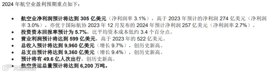 近日,国际航空运输协会(IATA)宣布调整航空业2024年前景展望,今年全球航空业净利润预计将达到305亿美元,净利润率达3.1%,总收入预计将达到9960亿美元,同比增加9.7%,创历史新高;营业利润将达到599亿美元。