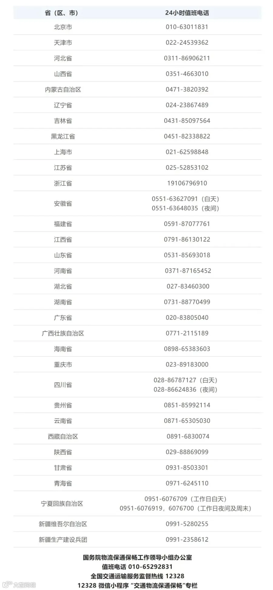 各省交通物流保通保畅24小时值班电话