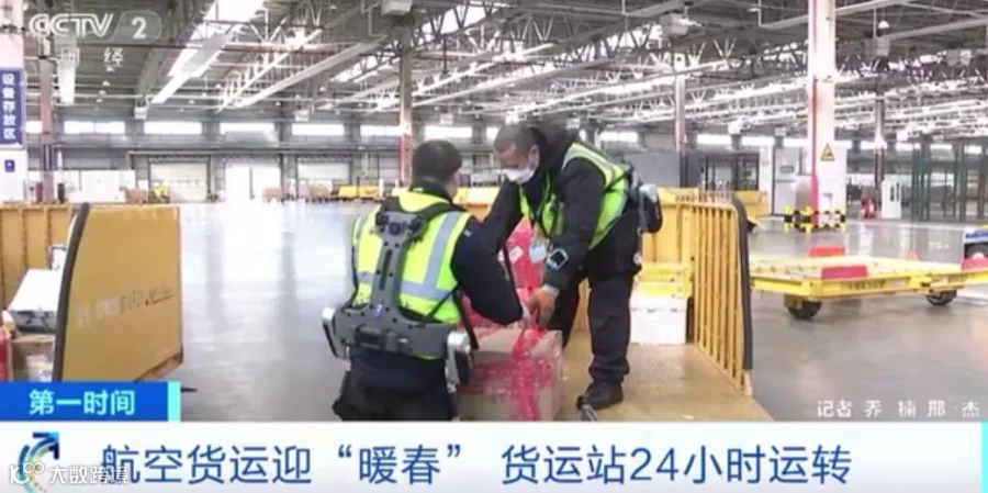 春节前后货站的来货量大增,货物品种多样,包装规格也不尽相同,很多都需要人工处理,单一货物最重能达60公斤,就算是轻一点的也有30公斤重,能够保护身体、提高效率的外骨骼机器人,成了装卸好帮手。