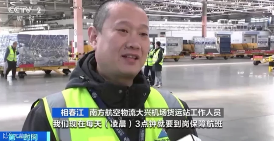 南方航空物流大兴机场货运站工作人员 :我们现在每天早晨3点要到岗来保障航班,整个货站是24小时运转。一天有100多个航班,在不同的时间点。
