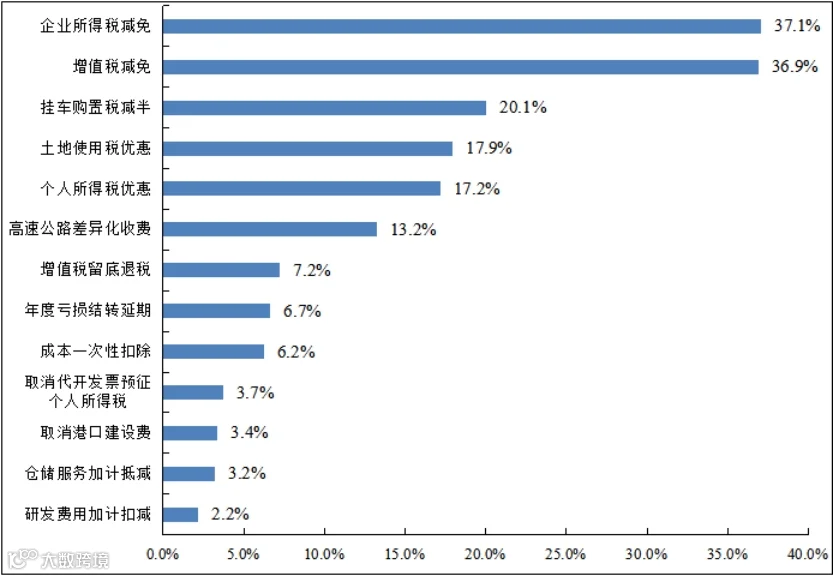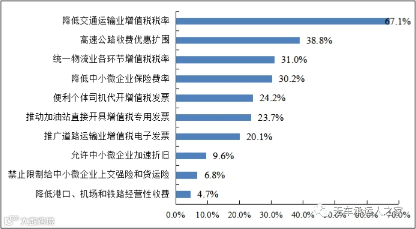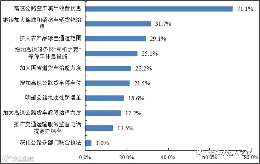 希望获得的税费支持政策排名第二的是高速公路收费优惠扩围。企业反映,高速公路由原来的计重收费方式改为按车(轴)型收费方式,空车、轻泡货运输为主的快递车辆,单程运输为主的冷链、车辆运输车等车辆通行费上涨较多,导致这些车辆选择走国道,增加了国道拥堵也浪费了高速公路资源,亟需出台更具针对性的措施引导空车等回流高速。