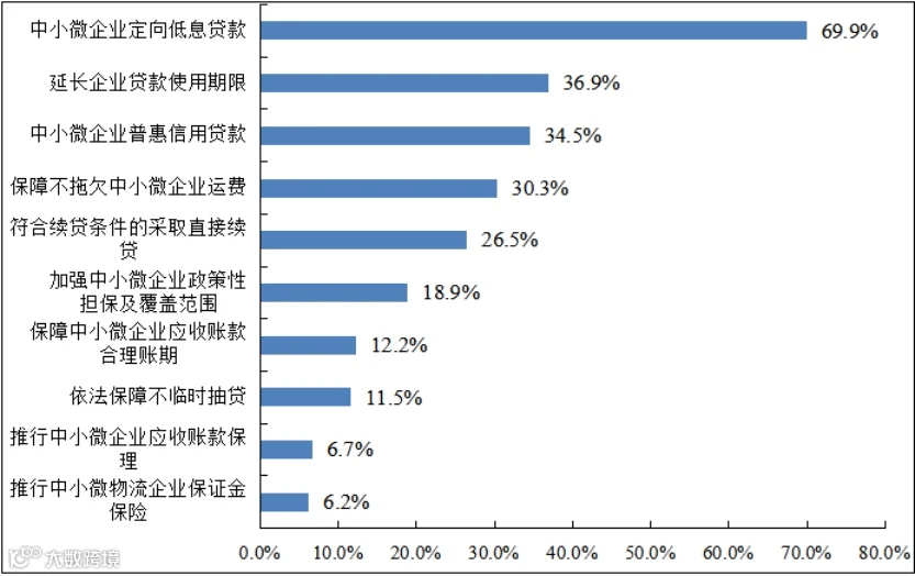 超过三分之一的企业希望延长企业贷款使用期限。目前,银行贷款往往是一年一贷,企业往往需要提前3个月就把钱筹备出来准备偿还,资金只能使用9个月左右,这也是一年期贷款利用效率不高的原因之一。超过四分之一的企业希望银行对于符合条件的企业采取直接续贷政策。企业反映,银行自动展期还很难实现,仍需要先还后贷,资金使用成本较高。还有企业希望依法保障不临时抽贷、断贷,这也是导致企业突发风险的原因之一。