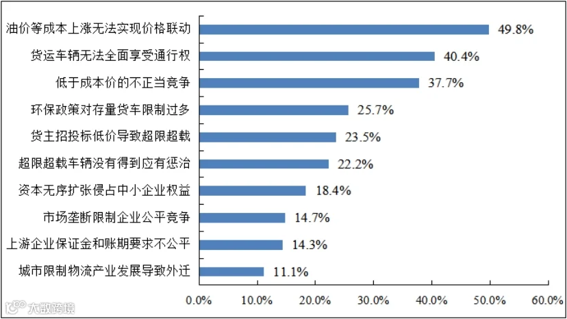 此外,货主招投标低价导致超载超限也是企业反映主要的不公平竞争问题。目前,《道路运输条例》对于托运人没有相关的制度约束,由于市场总体过剩,供过于求的格局,货主企业有动力压低运价或引导超载来影响市场。接受价格的承运企业和个体司机不得不冒险采取超限超载方式。同时,由于超限超载车辆没有得到应有惩治,导致合规车辆竞争力下滑,存在“劣币驱逐良币”现象,也是企业认为不公平的重要问题。