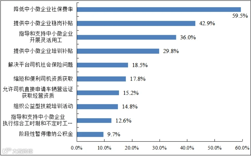 近两成的企业希望解决平台司机社会保险问题。近年来,随着平台经济的发展,中小微企业使用平台来寻找车源日益普遍。但是平台上的司机大部分是个体性质,没有工伤保险等社会保险导致出现事故后企业纠纷难以解决。
