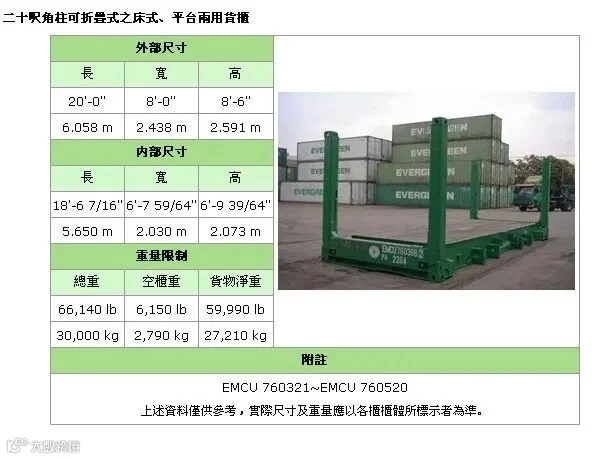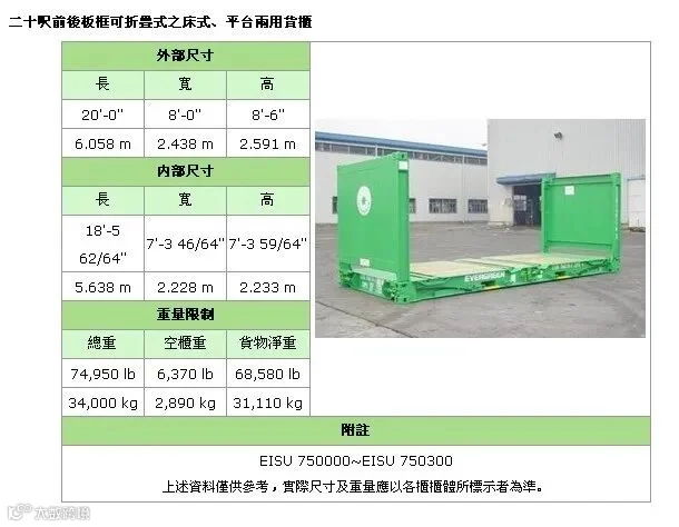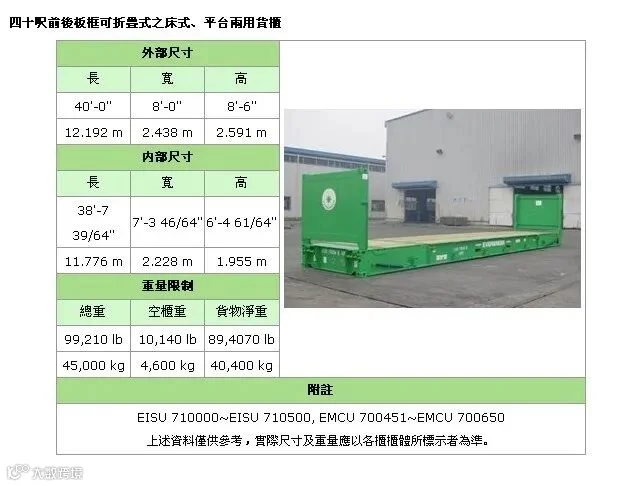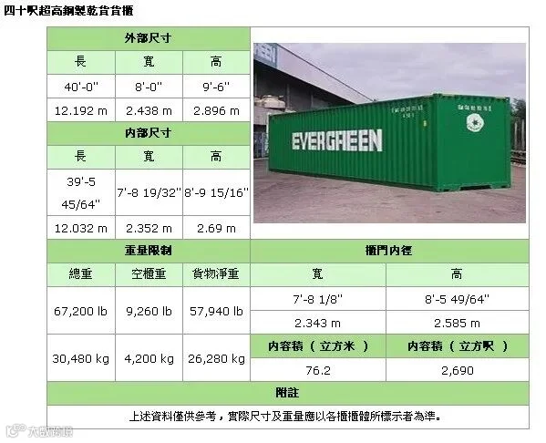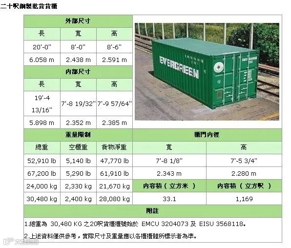 备注:集装箱是按照国际通用标准设计制造。因为制造工厂繁多,所以每个船东的集装箱尺寸会略有差别,但都是大同小异。