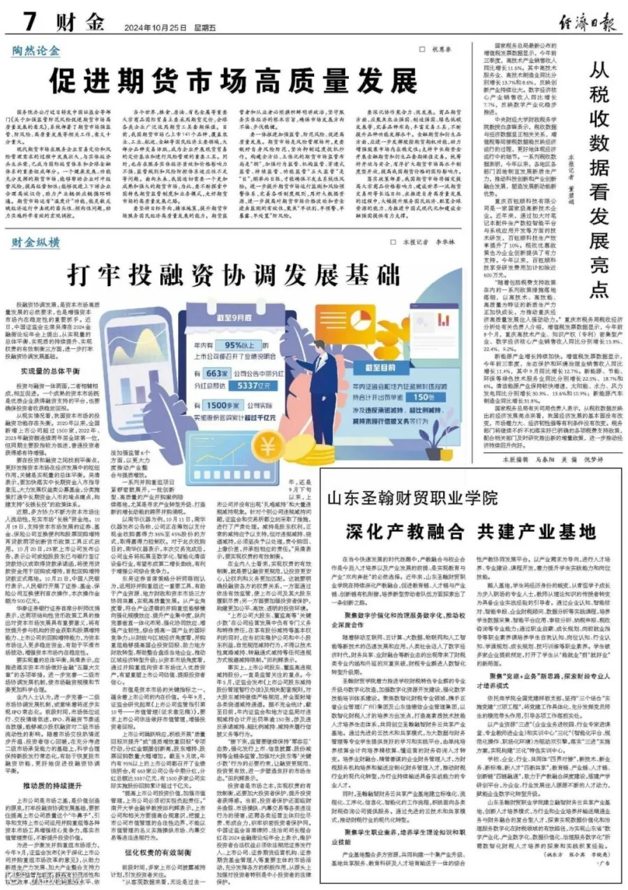 10月25日,《经济日报》在其第七版重要位置,隆重推出了题为《深化产教融合,共筑产业基地新典范:山东圣翰财贸职业学院探索数智化人才培养新路径》的深度报道。