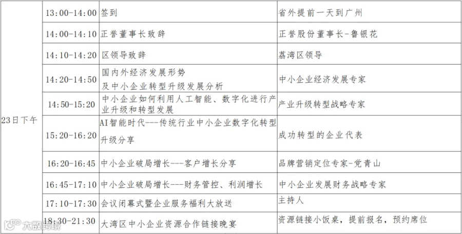 正誉股份,作为一家深耕广东省及全国中小微企业的专业服务机构,广东省内服务超2万家企业,财务共享平台为全国10万家企业提供专业服务;正誉股份率先行业数字化升级,打造财务共享平台为中小微企业降本增效和发展赋能,实现了公司的转型发展;我们深知中小企业的发展瓶颈和转型升级之难。新年开年之际,我们拟邀请大湾区1000家企业举办峰会,期望回馈新老客户的同时,给企业带来宏观形势、政策的方向指引,带来人工智能、数字化时代下产业升级、破局增长的新思路。