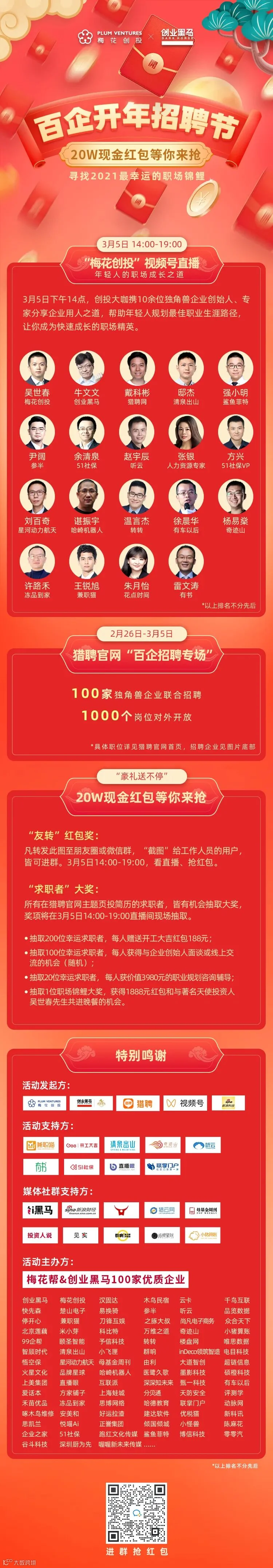 为此,梅花创投、微信视频号、新浪科技、i黑马、猎聘网等联合举办“2021最幸运的职场锦鲤”活动,投资人说等自媒体为指定官方宣传渠道。