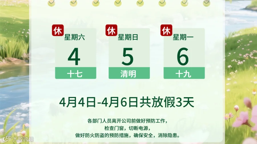 帝声电子为了让员工们能够在清明节期间有充足的时间进行祭祀、踏青等活动,特根据国家法定节假日的规定,结合公司实际情况,制定了合理的放假安排。今年清明节放假时间为[2026年4月4日至6日],共计[3]天。