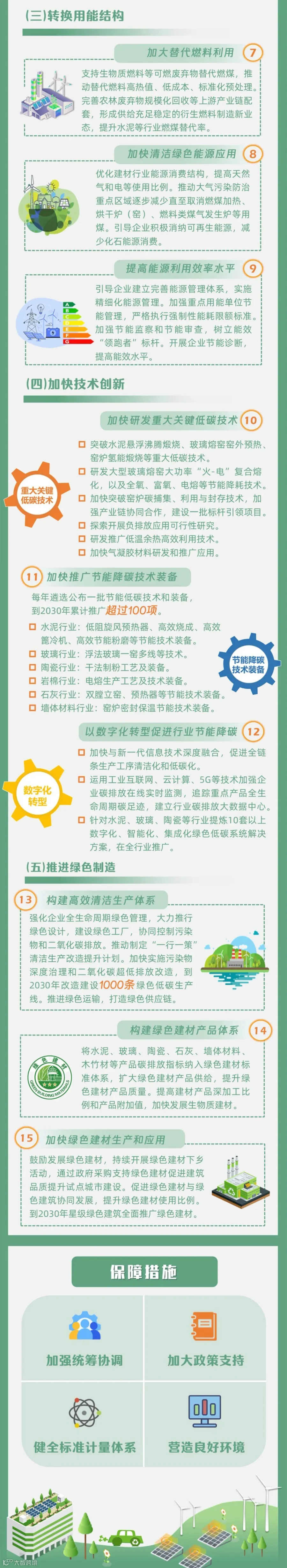 绿色制造是建材行业碳达峰的要求。建材行业要结合破碎、均化、配料、成型、煅烧等生产过程工艺特点,着力于过程低碳化、产业循环化、产品绿色化等重点方向,促进行业全生命周期绿色低碳化转型。