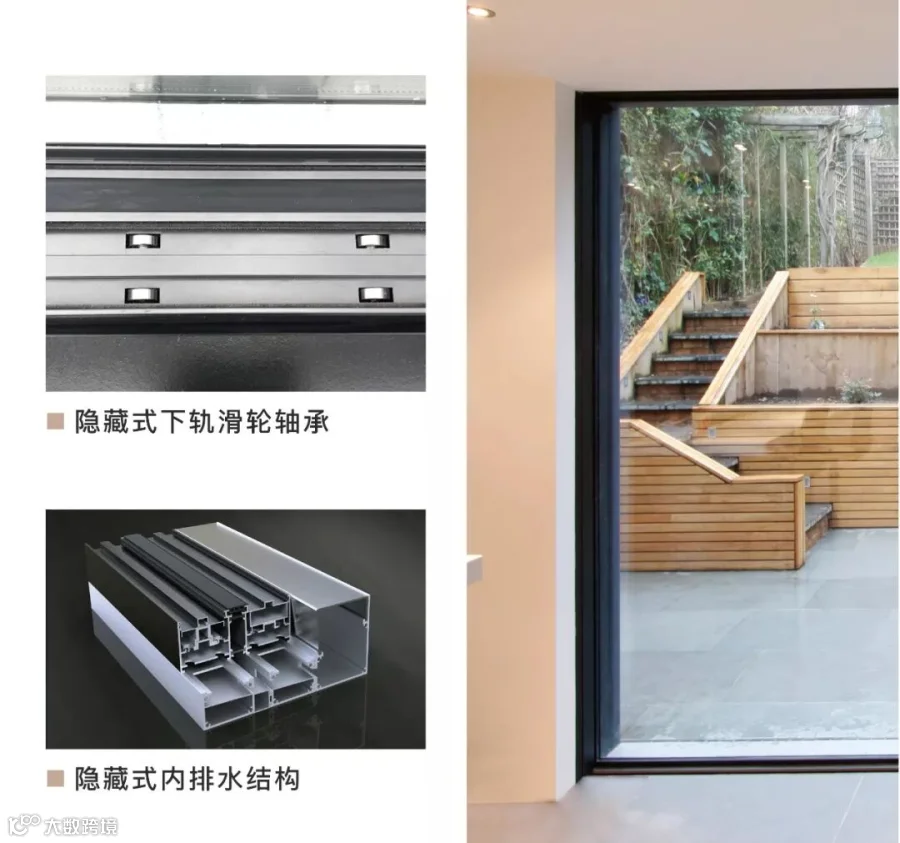 更高的玻璃铝框比,隔热性能系统有效提升,隐藏下轨一一配滚轮轴承,单扇承重最大可达1000KG。