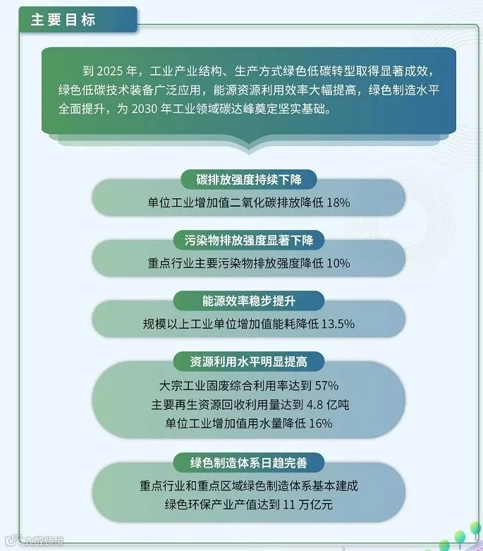 《规划》提出,到2025年,我国能源效率稳步提升,规模以上工业单位增加值能耗降低13.5%。资源利用水平明显提高,大宗工业固废综合利用率达到57%,主要再生资源回收利用量达到4.8亿吨,单位工业增加值用水量降低16%。污染物排放强度显著下降,重点行业主要污染物排放强度降低10%。绿色制造体系日趋完善,重点行业和重点区域绿色制造体系基本建成,绿色环保产业产值达到11万亿元。