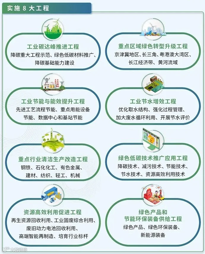 《规划》按照“聚焦一个行动、构建两大体系、推动六个转型、实施八大工程”的整体工作安排,围绕实施工业领域碳达峰行动,构建绿色低碳技术体系、绿色制造支撑体系,推进工业向产业结构高端化、能源消费低碳化、资源利用循环化、生产过程清洁化、产品供给绿色化、生产方式数字化等方向转型,提出具体举措,配套实施八个重大工程。