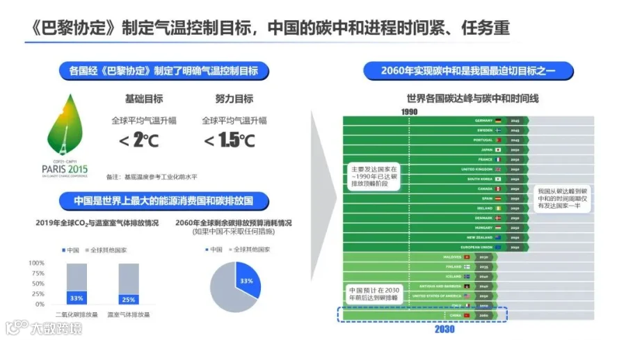 中国在人类“碳中和”进程中扮演着不可或缺的作用。作为世界上最大的能源消费国和碳排放国,中国的二氧化碳的排放量占全球总量的三分之一,温室气体的排放量约占全球总量的四分之一。中国现有的排放密集型基础设施如果继续以相同方式运作,到2060年预计将排放1750亿吨的二氧化碳。对“将全球温度上升幅度限制在1.5℃”这个目标来说,排放1750亿吨二氧化碳意味着中国占用了全球排放预算的三分之一。
