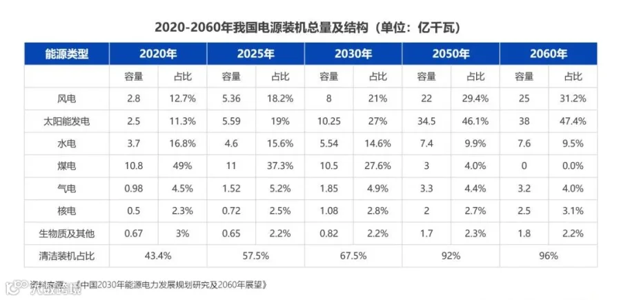 2021年10月发布的《中共中央国务院关于完整准确全面贯彻新发展理念做好碳达峰碳中和工作的意见》提出:到2025年,全国化石能源消费比重,要降低到80%左右;到2030年,降到75%左右;到了2060年,比重要降低到20%以下。另外根据《中国2030年能源电力发展规划研究及2060年展望》中对各类型能源装机量的占比规划,我们进一步确认了中国选择了以“减少碳排放”为主,“增加碳吸收”为辅的路径。