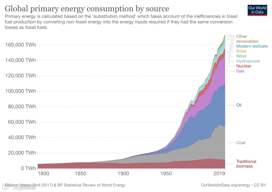 在工业革命之前,人类主要的能源来源是自然界的木材。在1840年,煤炭在世界能源消耗中的占比首次超过5%。这个比例在1900年才达到50%。后来石油和天然气逐渐被广泛应用,成为与煤炭一样的主流化石能源。