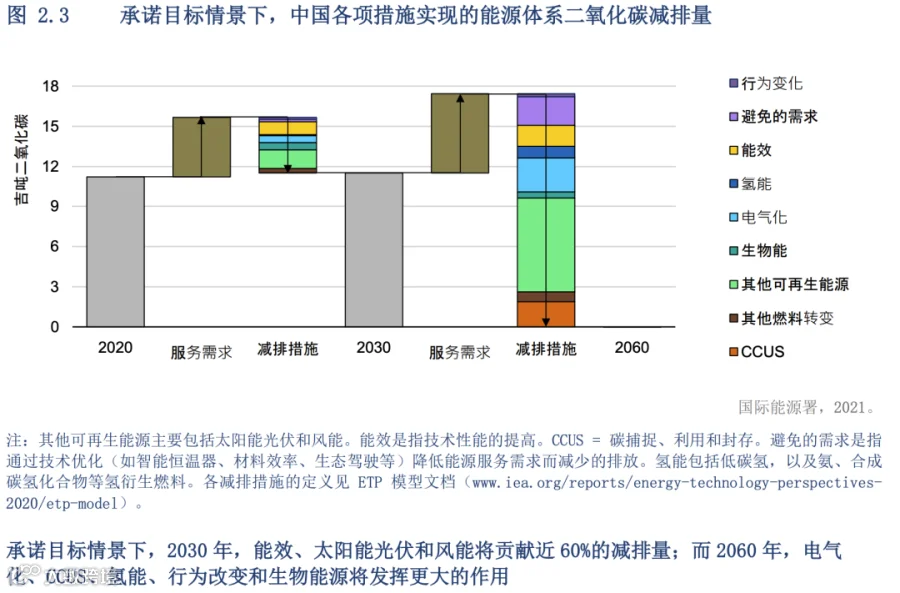 但是对任何一国而言,不可能只在一个方向上持续突破来实现本国净零排放所需的减排量。中国也不例外。根据IEA的测算,中国从2020到2030年的清洁能源转型可以建立在多项可用技术和有效政策的基础上,承诺目标情景中初期最大的减排量将来自能效的提高,特别是在工业过程、空间采暖制冷以及道路车辆方面。承诺目标情景下,仅能效一项就将贡献2030年二氧化碳减排量的四分之一左右,可再生电力(主要是风能和太阳能光伏)将贡献2030年减排总量的三分之一。到2060年,可再生能源的贡献份额将上升到近40%,能效的贡献比重将会下降至12%左右。