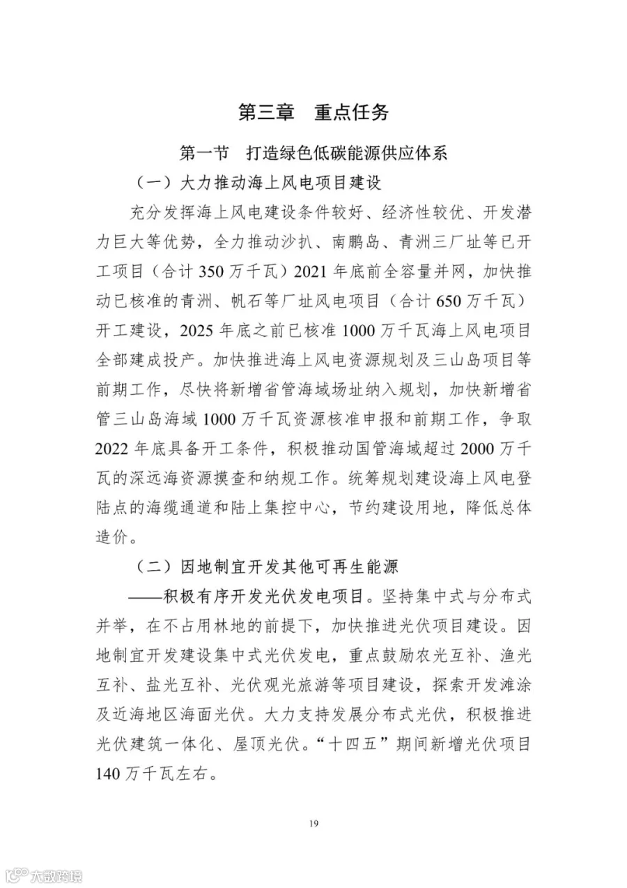 充分发挥海上风电建设条件较好、经济性较优、开发潜力巨大等优势,全力推动沙扒、南鹏岛、青洲三厂址等已开工项目(合计350万千瓦)2021年底前全容量并网,加快推动已核准的青洲、帆石等厂址风电项目(合计650万千瓦)开工建设,2025年底之前已核准1000万千瓦海上风电项目全部建成投产。加快推进海上风电资源规划及三山岛项目等前期工作,尽快将新增省管海域场址纳入规划,加快新增省管三山岛海域1000万千瓦资源核准申报和前期工作,争取2022年底具备开工条件,积极推动国管海域超过2000万千瓦的深远海资源摸查和纳规工作。统筹规划建设海上风电登陆点的海缆通道和陆上集控中心,节约建设用地,降低总体造价。