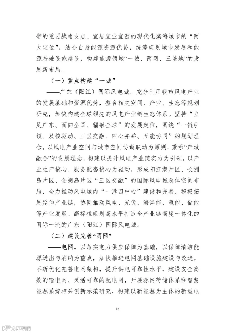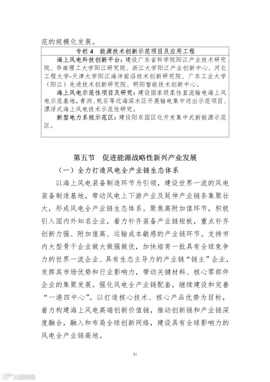 ——广东(阳江)国际风电城。充分利用阳江市风电产业的发展基础和资源优势,整合相关空间、产业、生态等规划研究,加快构建全球领先的风电产业链生态体系。坚持“立足广东、面向全国、辐射全球”的发展定位,围绕“一链引领、双核驱动、三区交融、四心并举、五能协同”的规划理念,以风电产业空间与城市空间协调联动为原则,秉承“产城融合”的发展理念,构建以提升风电产业链实力为引领,以产业生产核心、服务配套核心为驱动,形成阳江港片区、长洲岛片区、金朗岛片区“三区交融”的国际风电城总体空间布局,全力推动风电城内“一港四中心”建设和完善,积极拓展延伸产业链,协同推动风电、光伏、海洋能、氢能、储能等产业发展。高标准规划高水平打造全产业链高度一体化的国际一流的广东(阳江)国际风电城。
