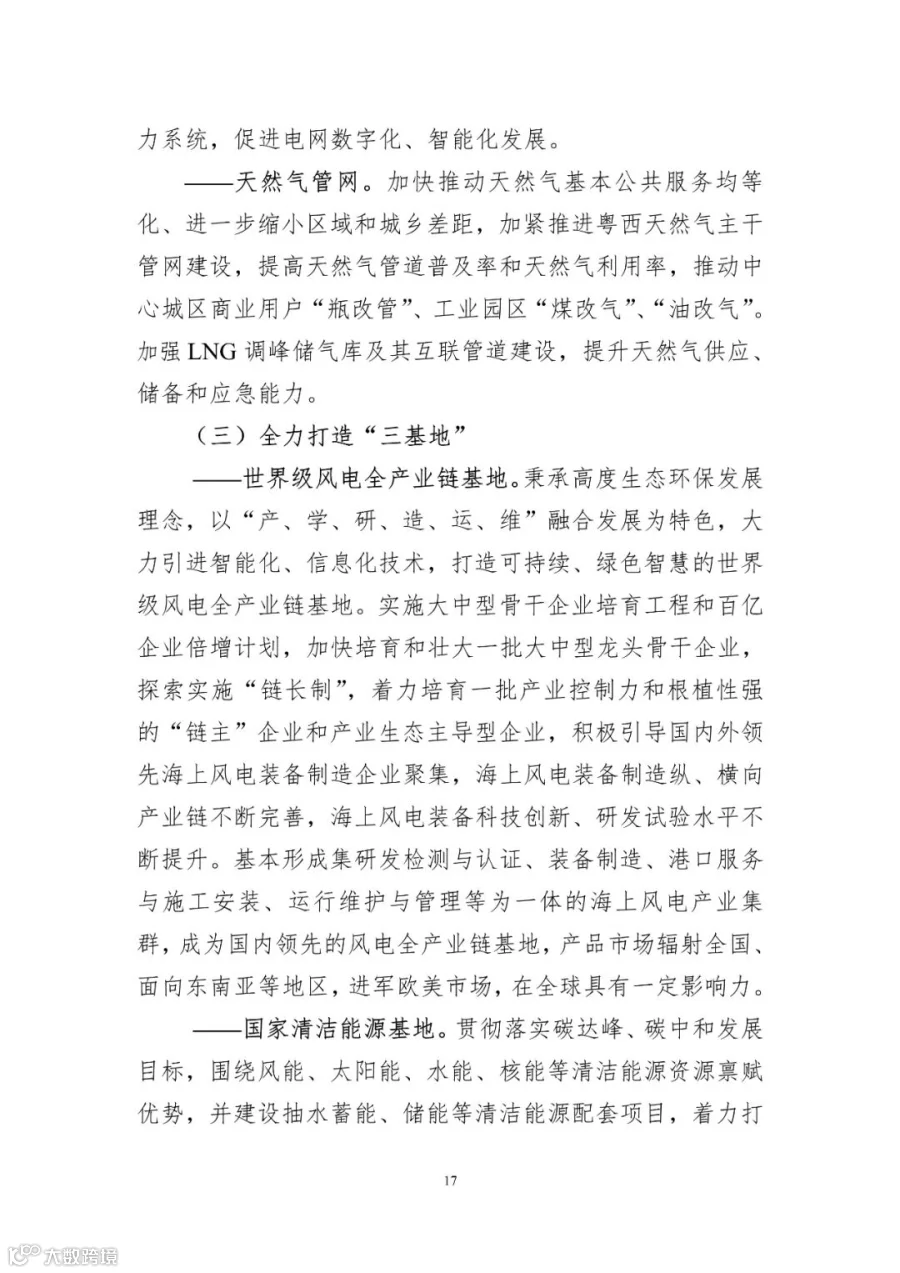 ——世界级风电全产业链基地。秉承高度生态环保发展理念,以“产、学、研、造、运、维”融合发展为特色,大力引进智能化、信息化技术,打造可持续、绿色智慧的世界级风电全产业链基地。实施大中型骨干企业培育工程和百亿企业倍增计划,加快培育和壮大一批大中型龙头骨干企业,探索实施“链长制”,着力培育一批产业控制力和根植性强的“链主”企业和产业生态主导型企业,积极引导国内外领先海上风电装备制造企业聚集,海上风电装备制造纵、横向产业链不断完善,海上风电装备科技创新、研发试验水平不断提升。基本形成集研发检测与认证、装备制造、港口服务与施工安装、运行维护与管理等为一体的海上风电产业集群,成为国内领先的风电全产业链基地,产品市场辐射全国、面向东南亚等地区,进军欧美市场,在全球具有一定影响力。