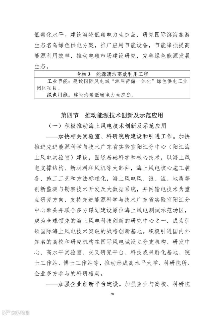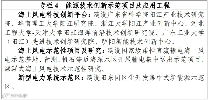 ——加快相关实验室、科研院所建设和引进工作。加快推进先进能源科学与技术广东省实验室阳江分中心(阳江海上风电实验室)建设,围绕基础科学和核心技术,以海上风电支撑结构、新材料和风机等大部件,海上风电核心施工装备、施工工艺和方法标准化,海上风电风、浪、流、地质等创新监测与勘察技术开发及大数据系统,并网输电技术为重点研究方向,支持先进能源科学与技术广东省实验室阳江分中心牵头并联合多方谋划建设原位海上风电测试示范场区,成为全球领先的海上风电科技创新的研究中心之一,成为引领国际海上风电技术突破的战略创新基地。积极引进国内外知名的高校和研究机构在国际风电城设立分支机构、研发中心、高水平实验室、交叉研究平台、科技成果孵化基地、院士工作站、博士工作站等,推动形成高水平大学、科研院所、企业多方参与的科研格局。